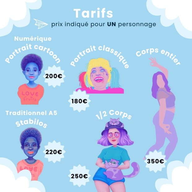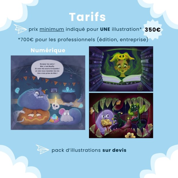 Je propose des tarifs adaptés à vos besoins et à la complexité du travail demandé. Je me base sur les recommandations tarifaires de la charte des auteurs illustrateurs. Voici des fourchettes de prix pour vous donner une idée de mes prestations :